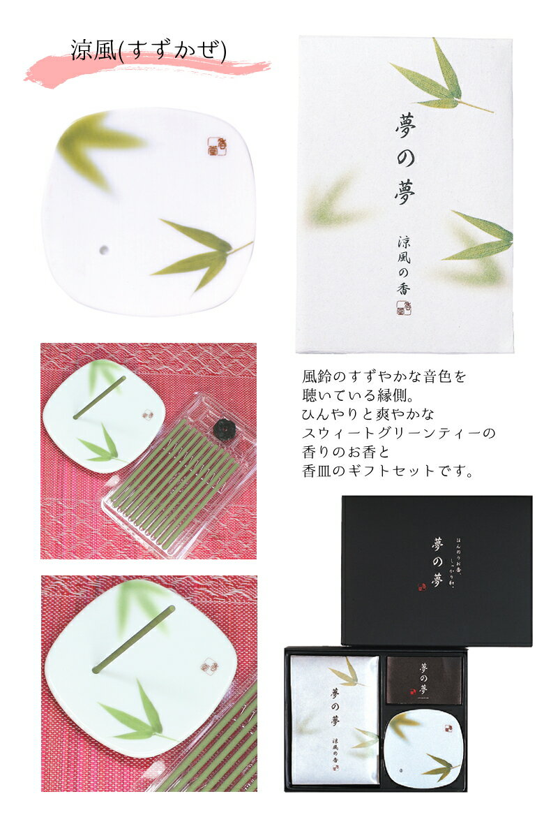 ※※※ 「夢の夢 お香 セット ギフトセット 涼風の香 スティック」の詳細 ・商品サイズ:高さ147mm×幅189mm×奥行30mm ・箱含む重量:約174g ・セット内容(成分):お香、香皿 ・香り 涼風の香:スウィートグリーンティー。